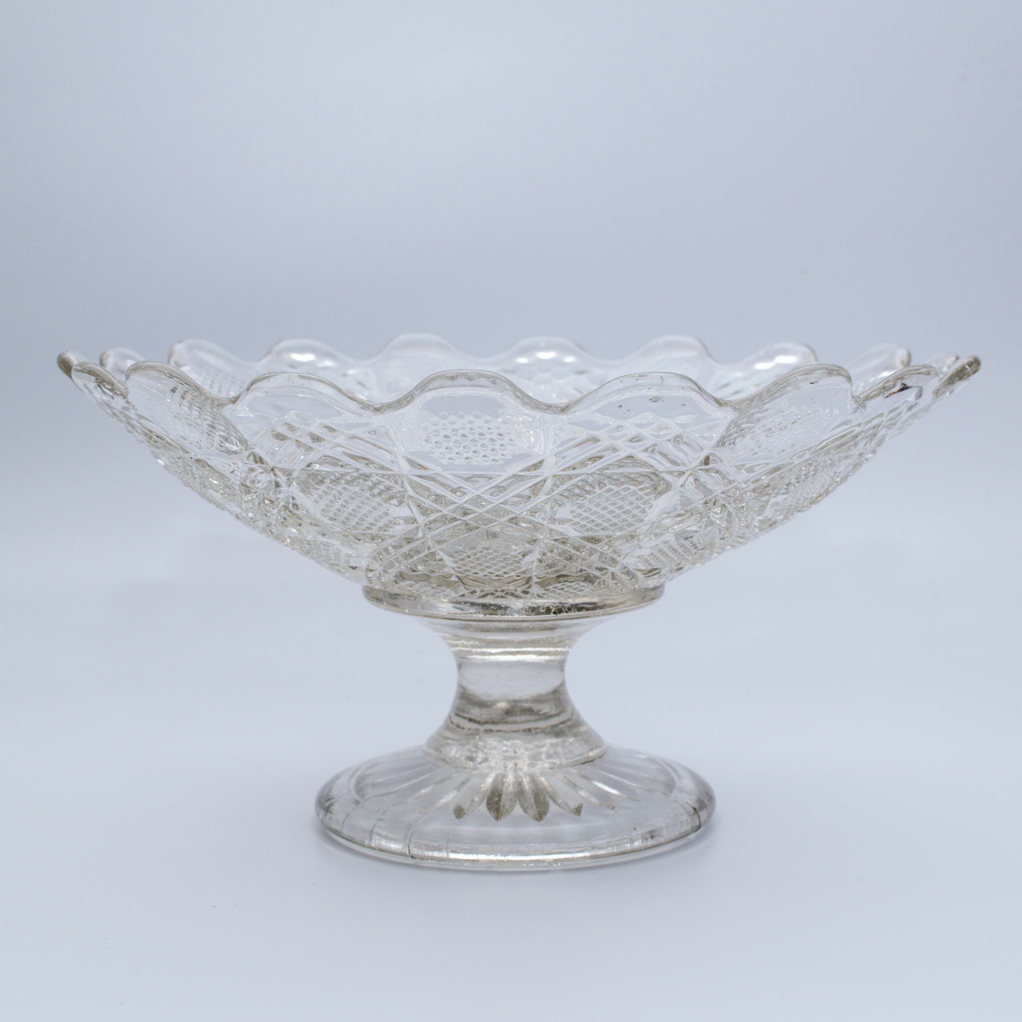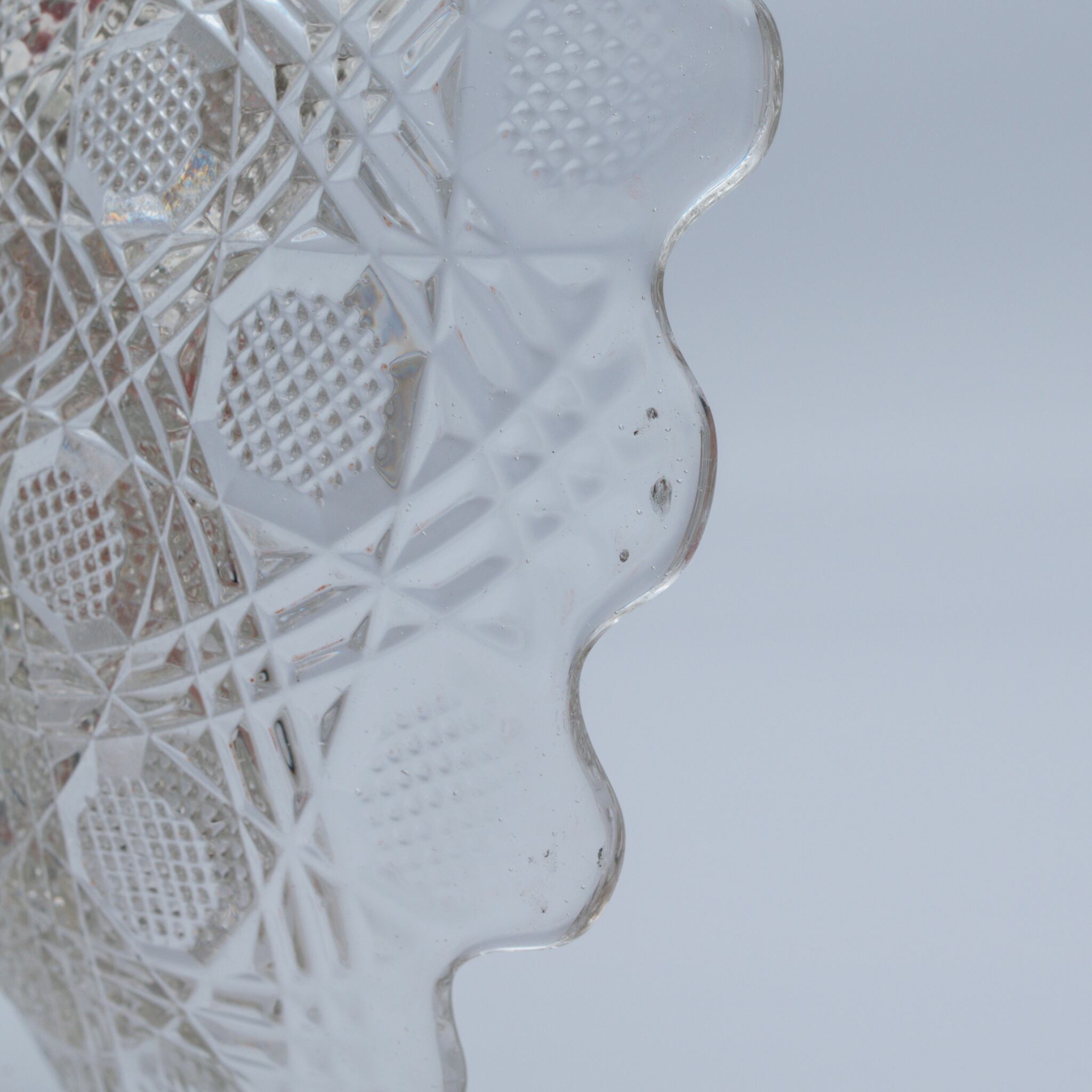1930年頃のイギリスでは、溶かしたガラスを型に流し込んで形成するプレスガラスが一般的でした。プレスガラス で作られた食器の特徴として、凹凸模様が綺麗に表現されております。