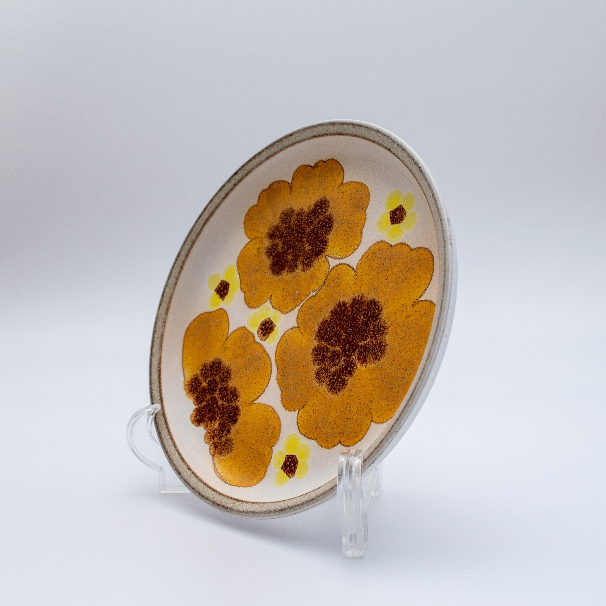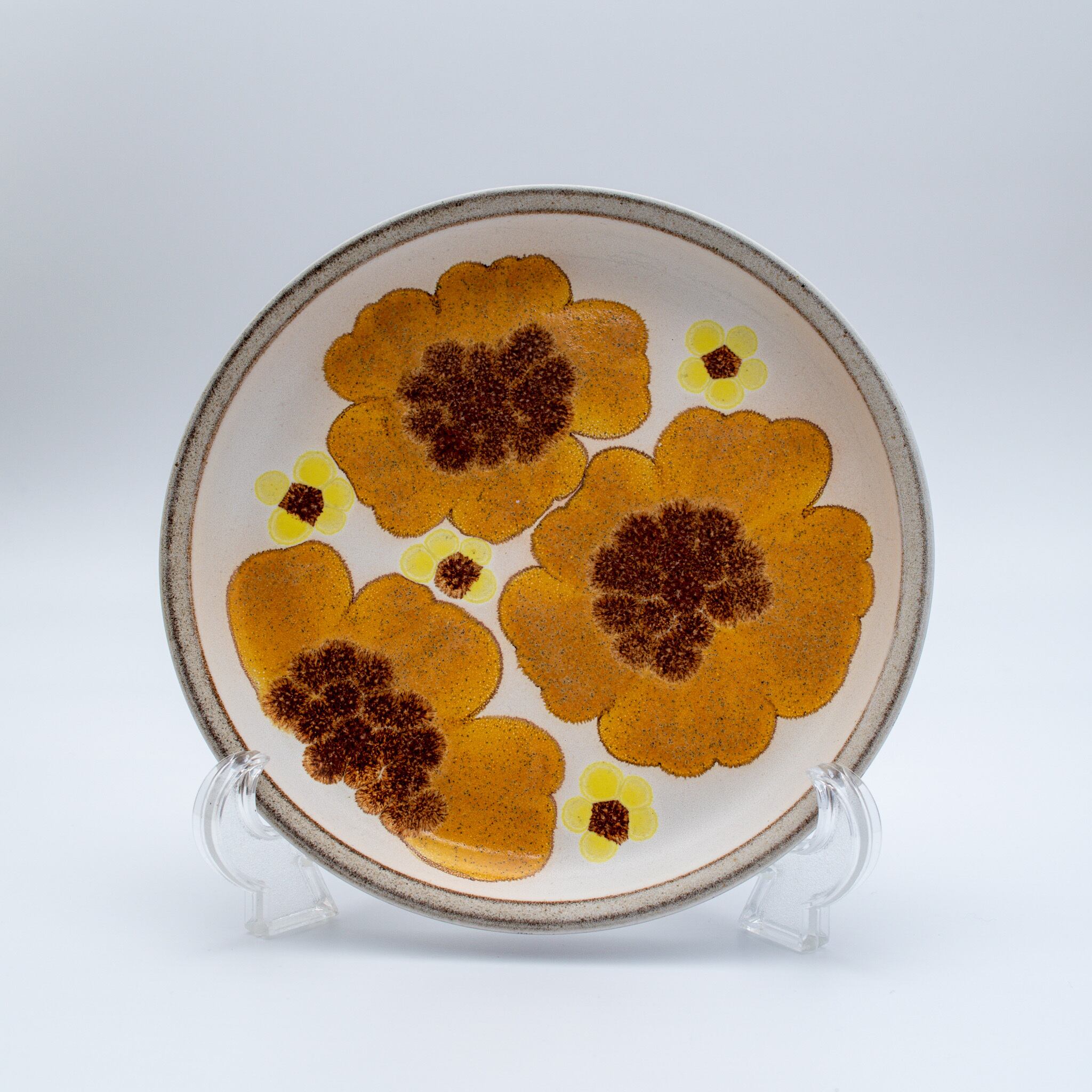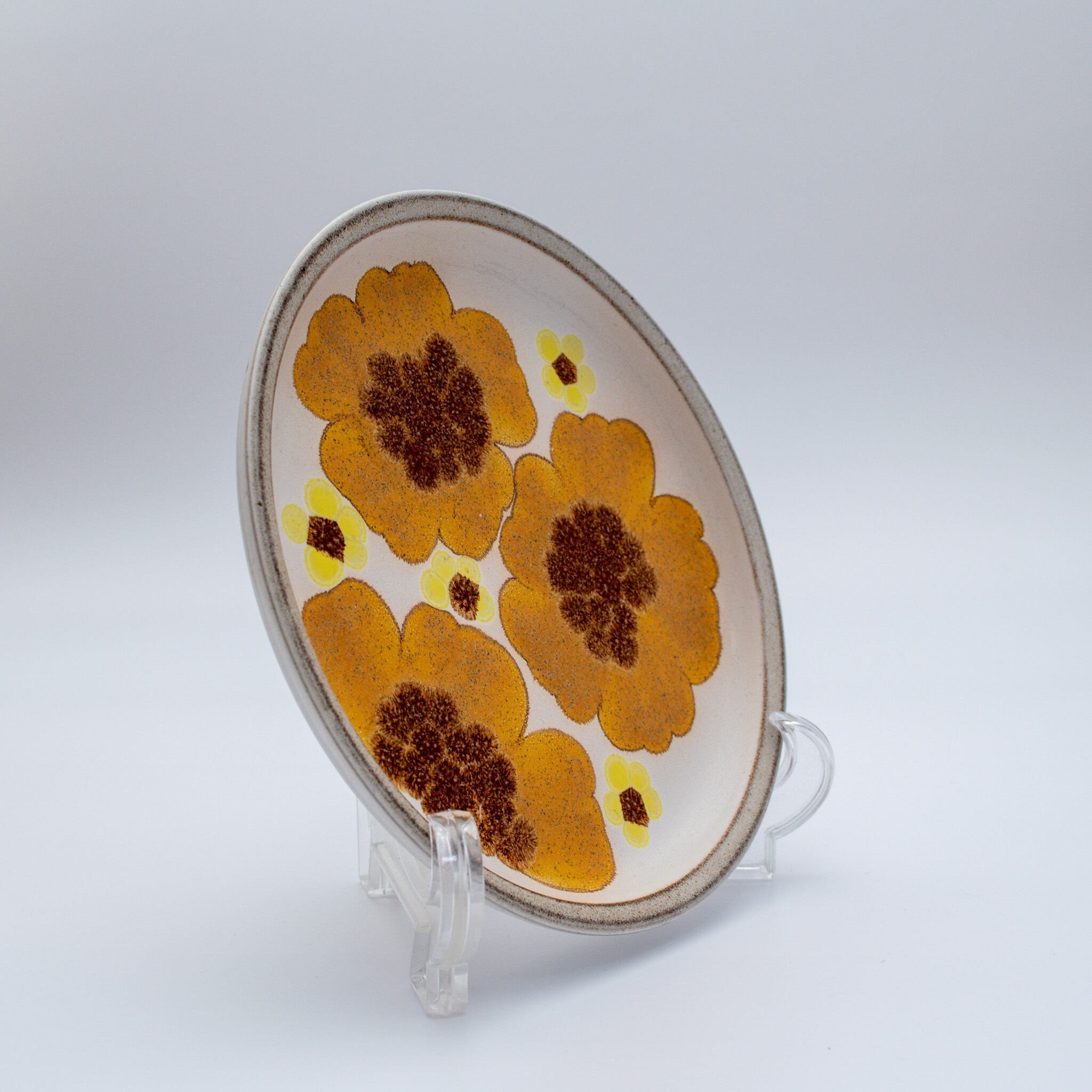 イギリスDENBY(デンビー)社のお皿です。お皿の表面 いっぱいに黄色の花が描かれています。