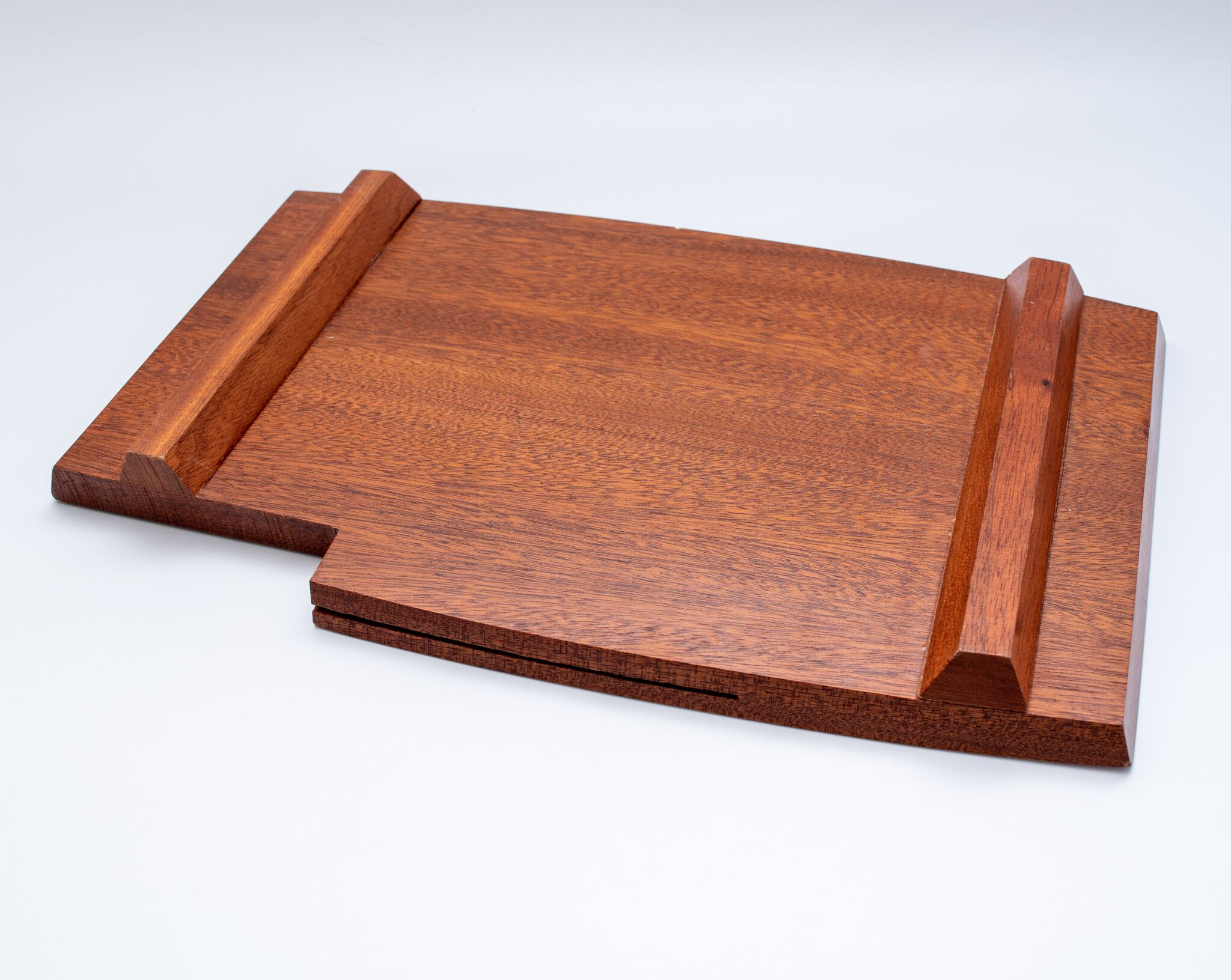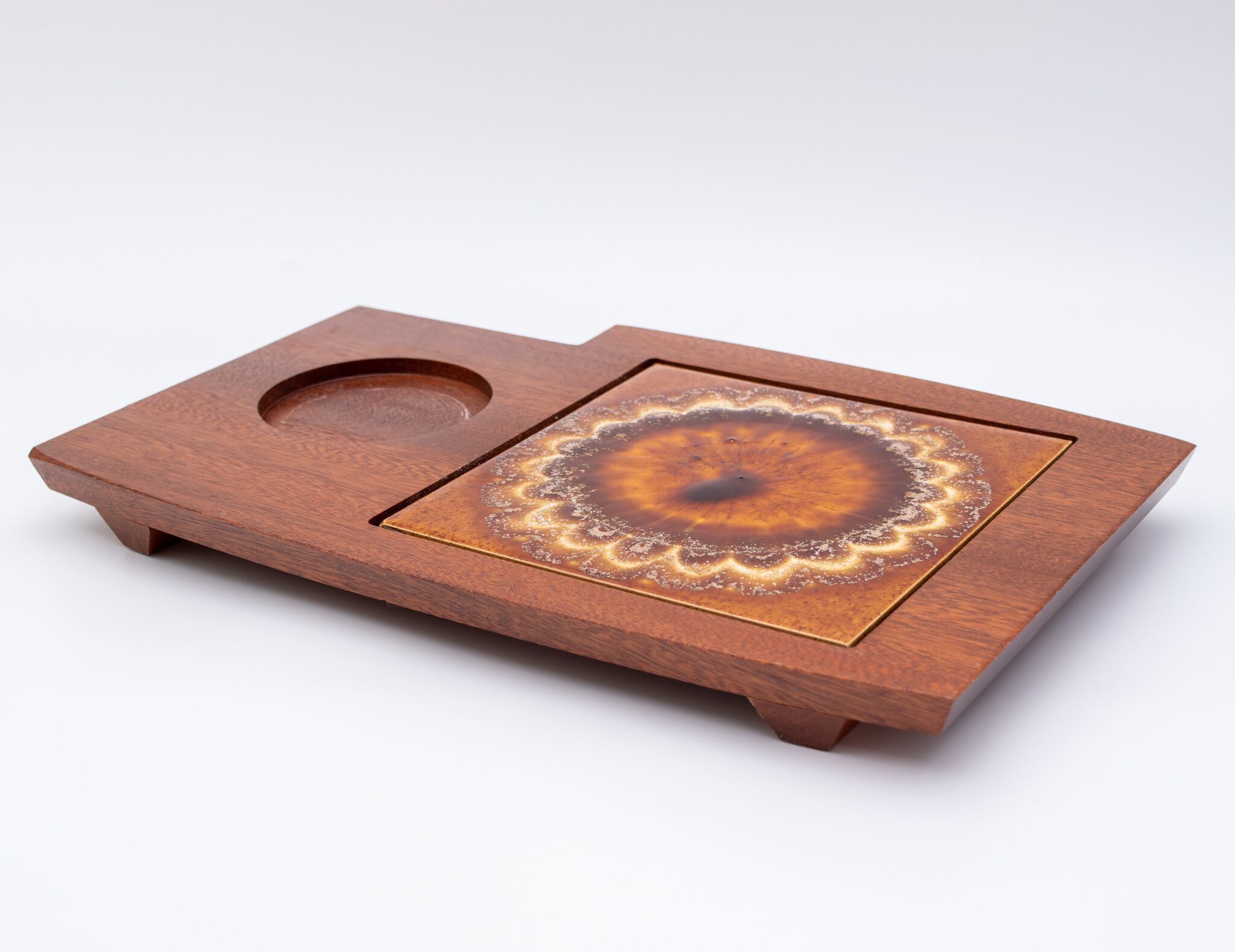 手作りのはめ込みタイルは、WyncraftのAlan Wallworkによるもので、とても素敵です。チーズナイフ用のスロットと小さなボウル用のディップ(ポテトチップス、ピクルス、ディップ、ナッツなど)を備えたチーク材のトレイ。裏側に2本の脚が付いています。
